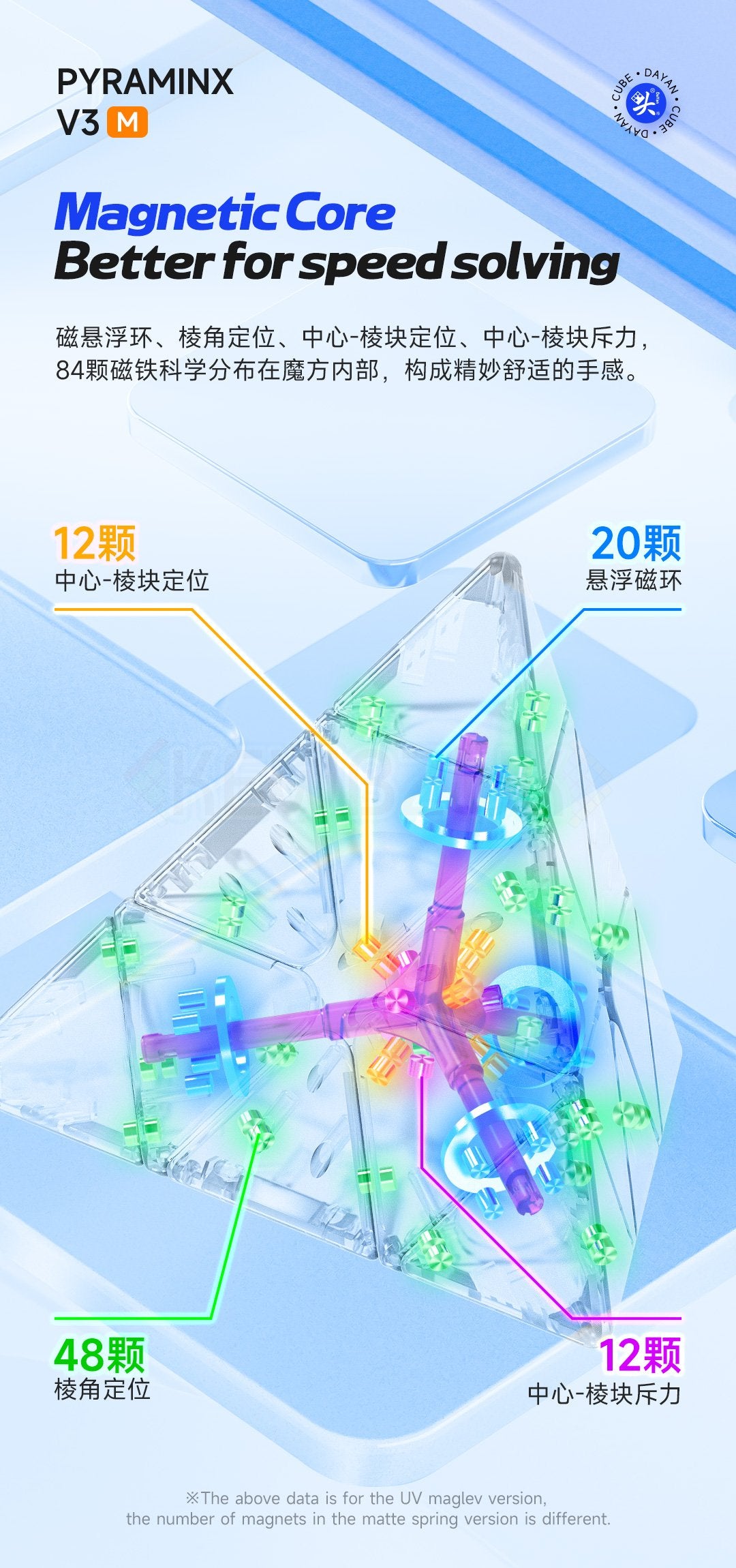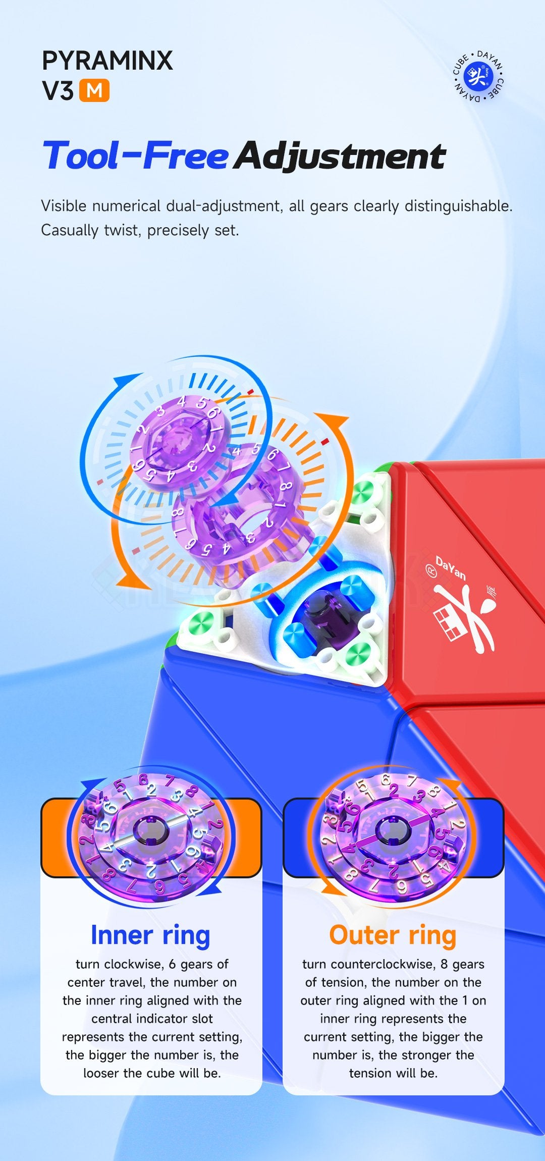 Introducing the DaYan Pyraminx v3, brand new for mid-2025 and absolutely bursting with the latest technology. The v3 standard features a ball-core with corner-core magnets that offer 5 levels of 'magnetism' (1 = min / 5 = max).