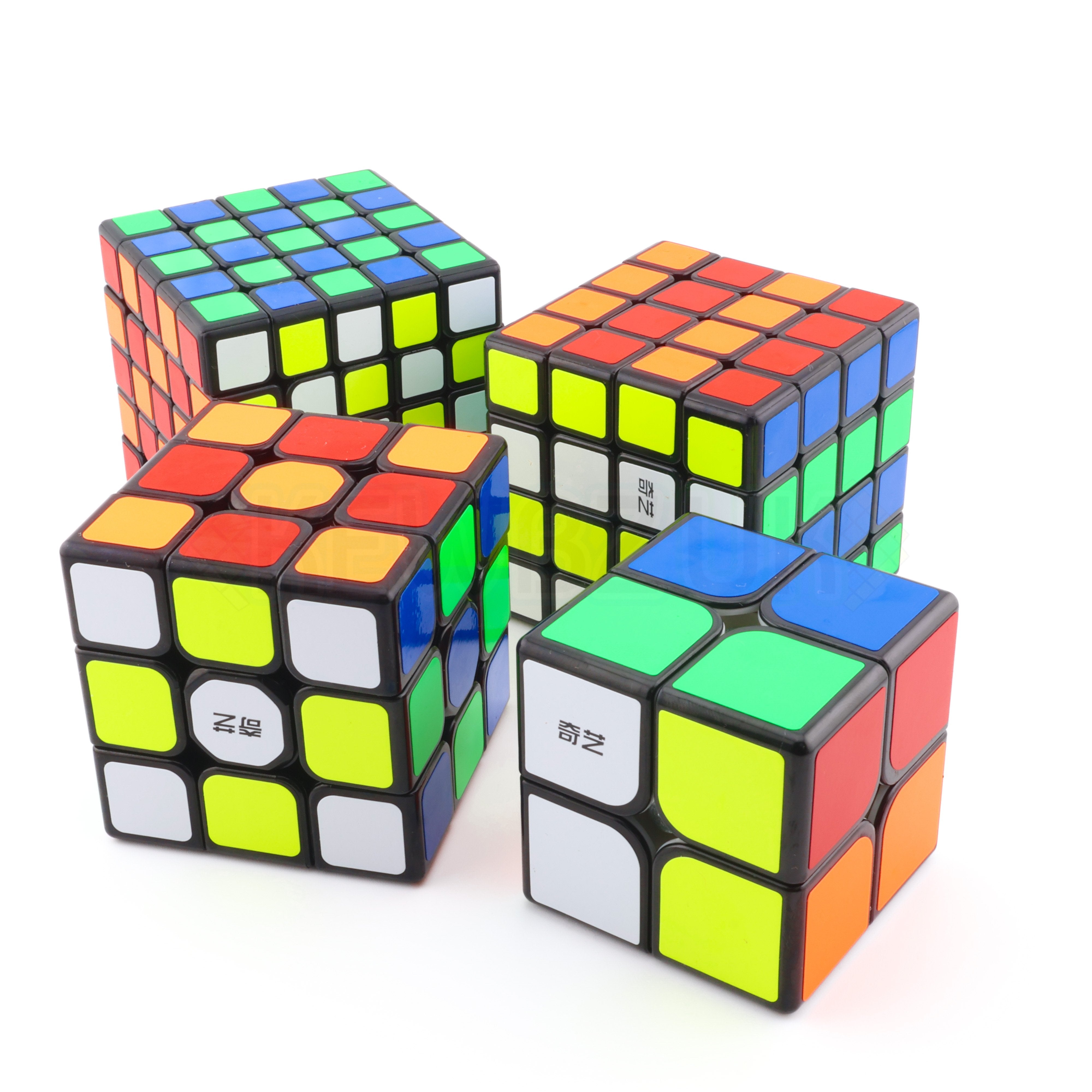 Featuring a QiYi QiDi W 2x2, QiYi Warrior 3x3, QiYi QiYuan 4x4 and QiYi Qizheng 5x5.