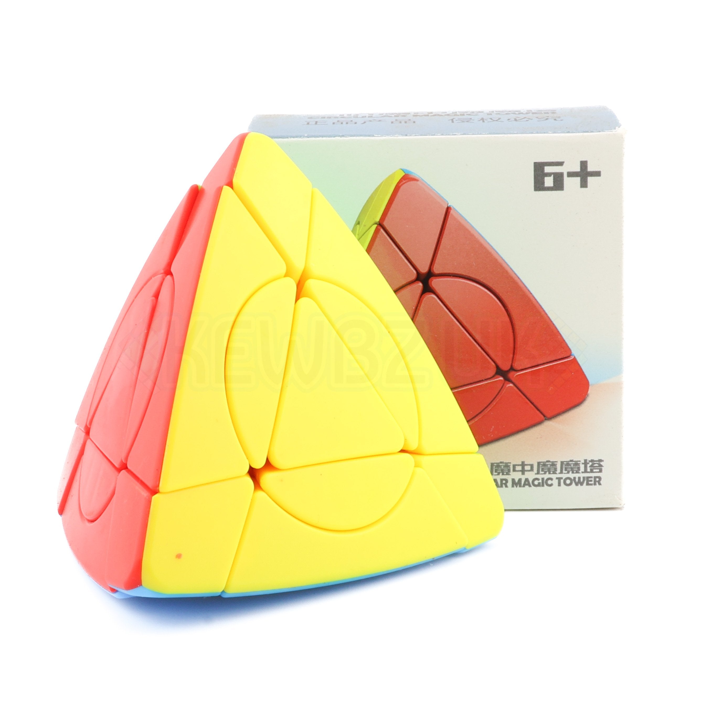The ShengShou Crazy Magic Tower is a fun little pyraminx shape mod designed to test those that love twisty puzzles. The added inner wing pieces which wrap around the center are not joined to either the center or the edge pieces, this gives an additional layer of complexity to this otherwise, basic puzzle.